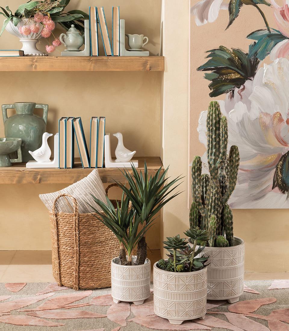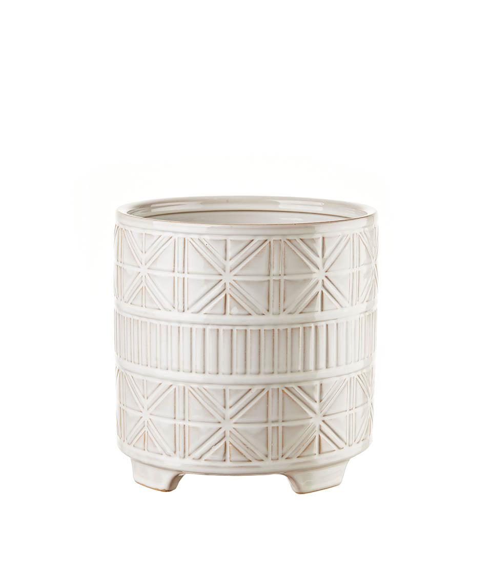 Cache-pot in ceramica con effetto anticato e decoro geometrico. Le diverse dimensioni permettono di creare un angolo green o impreziosire un ambiente con un plant decor armonioso.